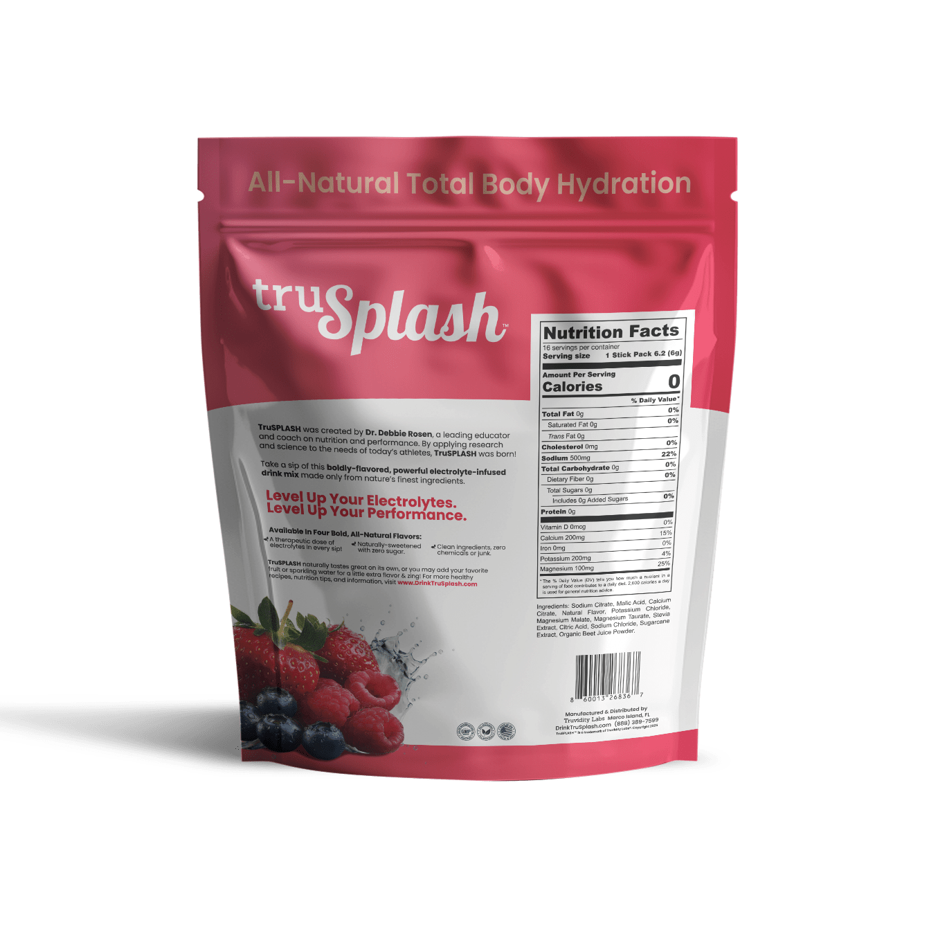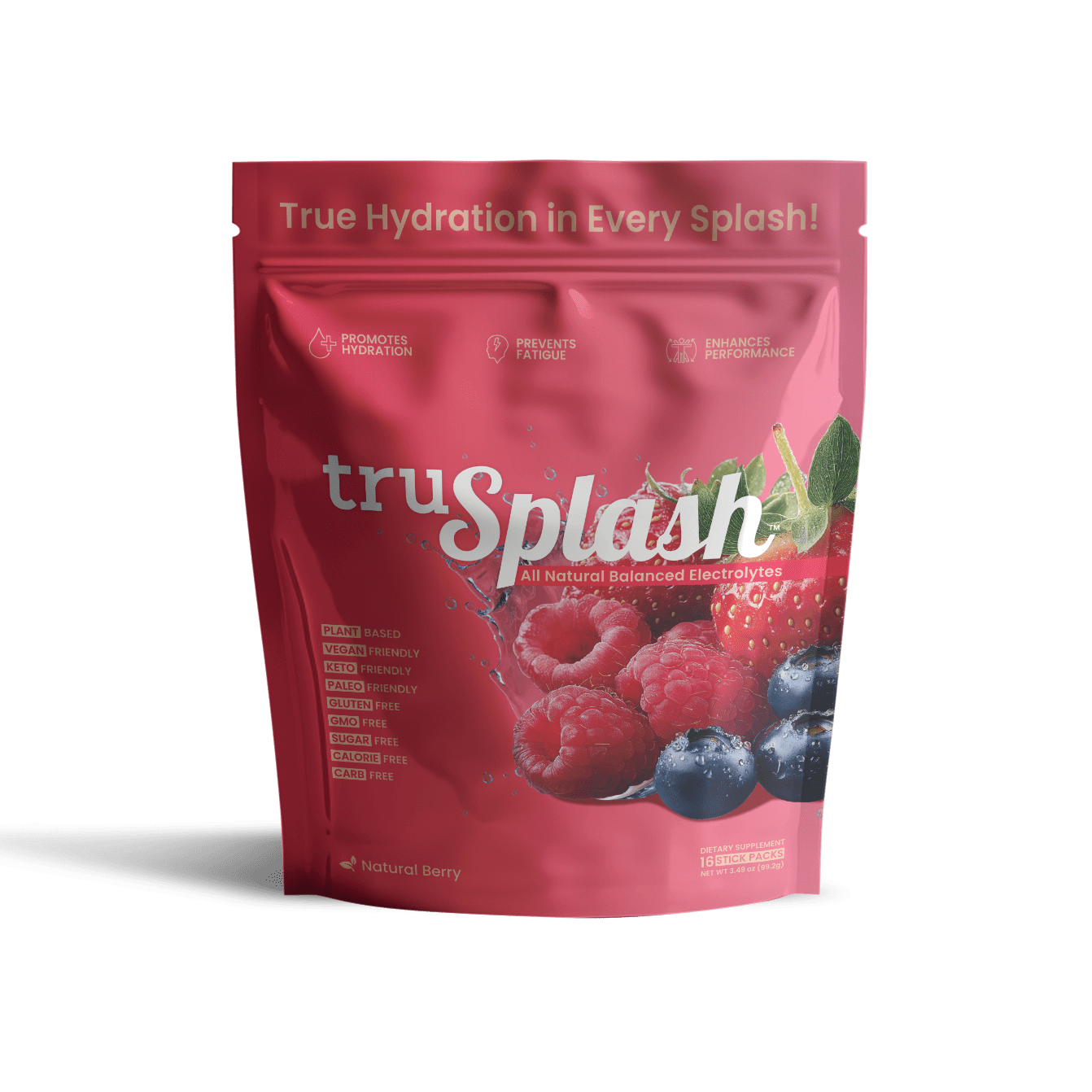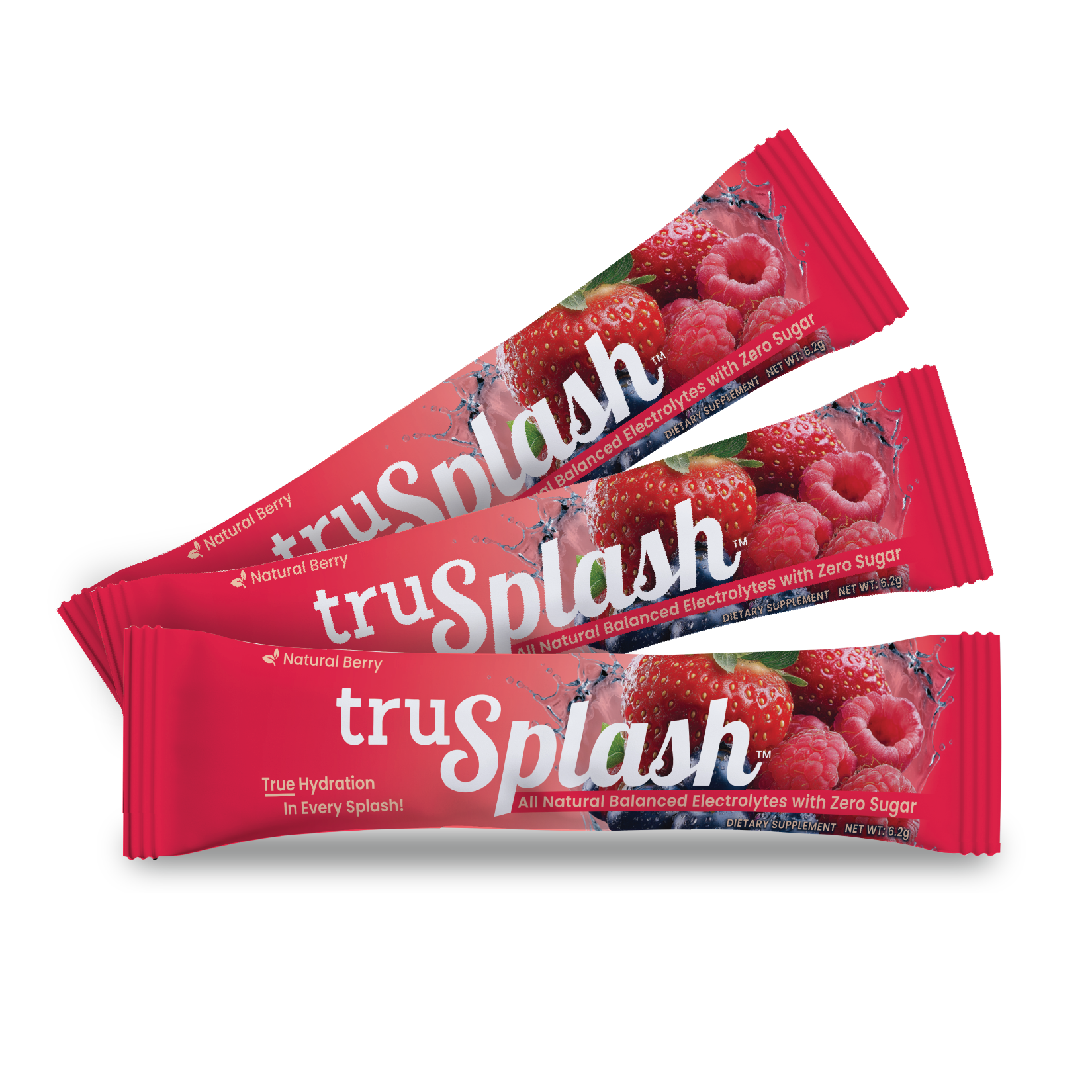 For Real On-The-Go Hydration. Introducing the truSplash Splash Pak, the ultimate hydration solution for on-the-go individuals. This resealable pouch contains 16 individual serving size truSplash sticks, each packed with therapeutic doses of balanced electrolytes, all natural flavors, and zero sugar.