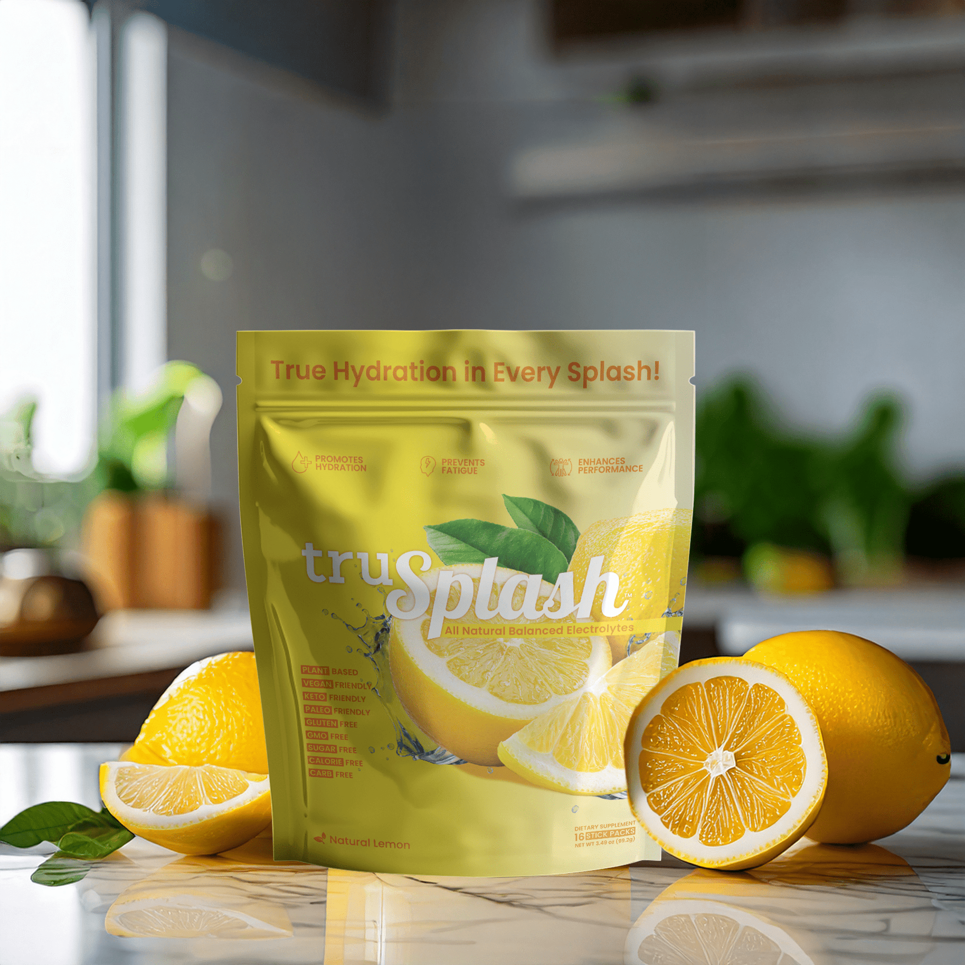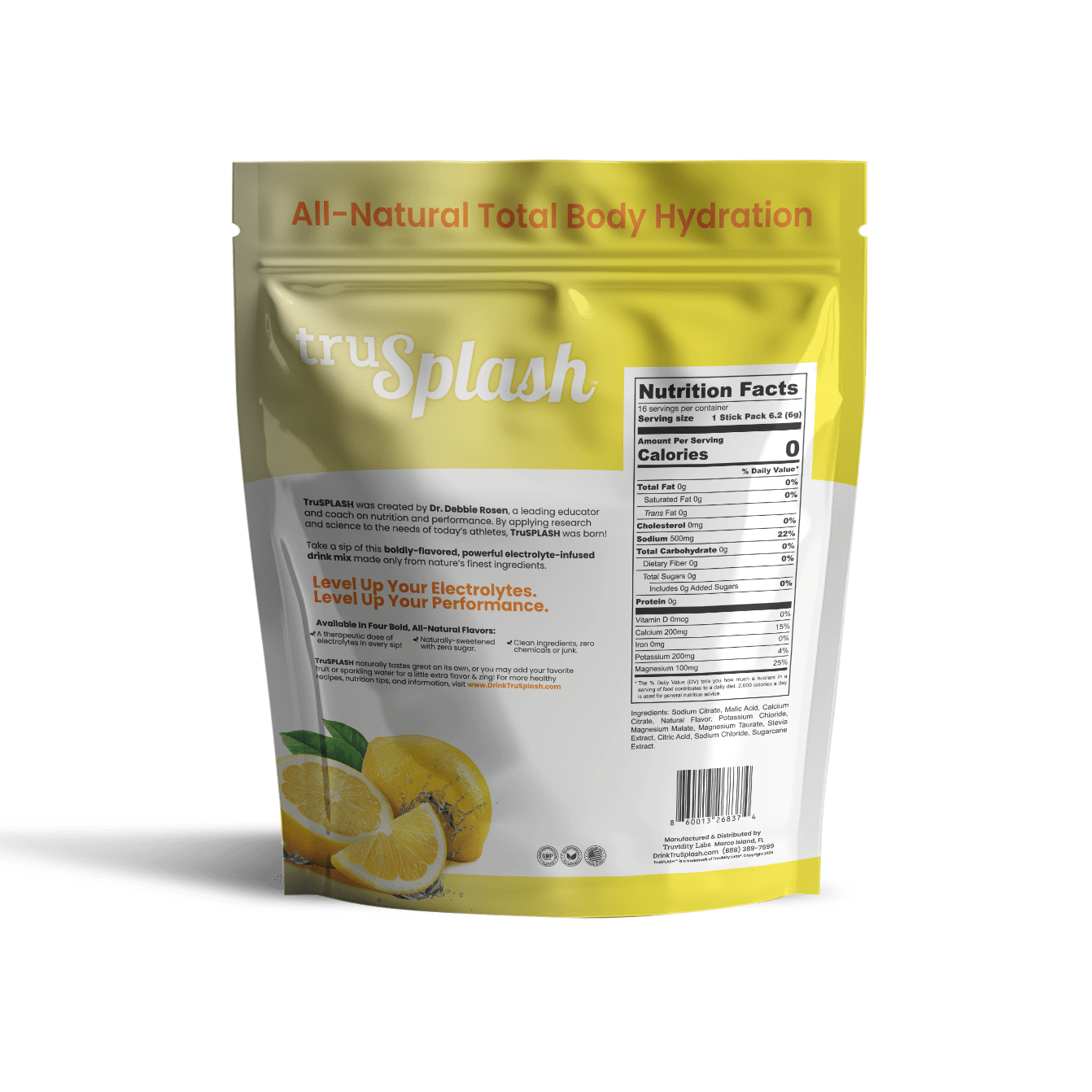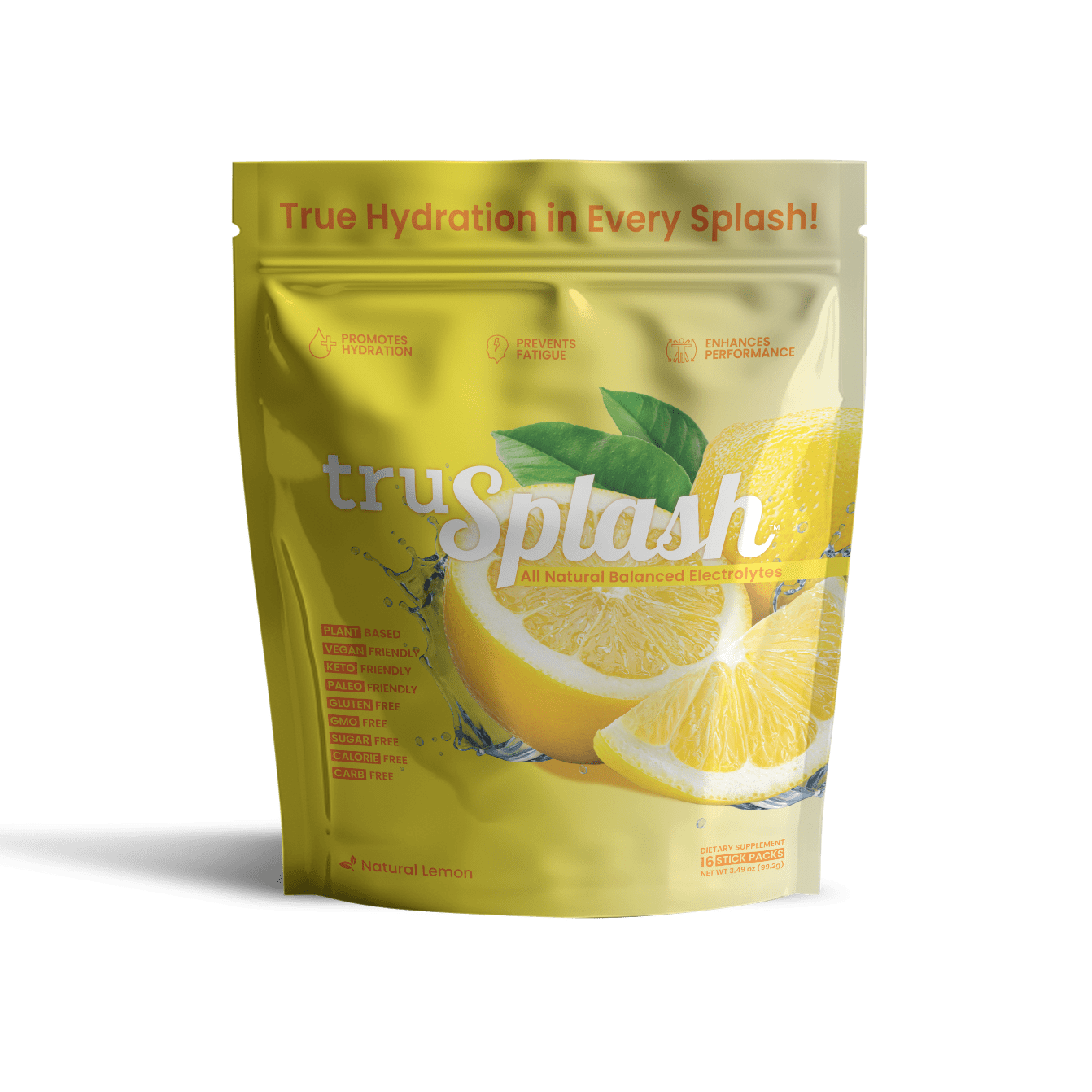 For Real On-The-Go Hydration. Introducing the truSplash Splash Pak, the ultimate hydration solution for on-the-go individuals. This resealable pouch contains 16 individual serving size truSplash sticks, each packed with therapeutic doses of balanced electrolytes, all natural flavors, and zero sugar.